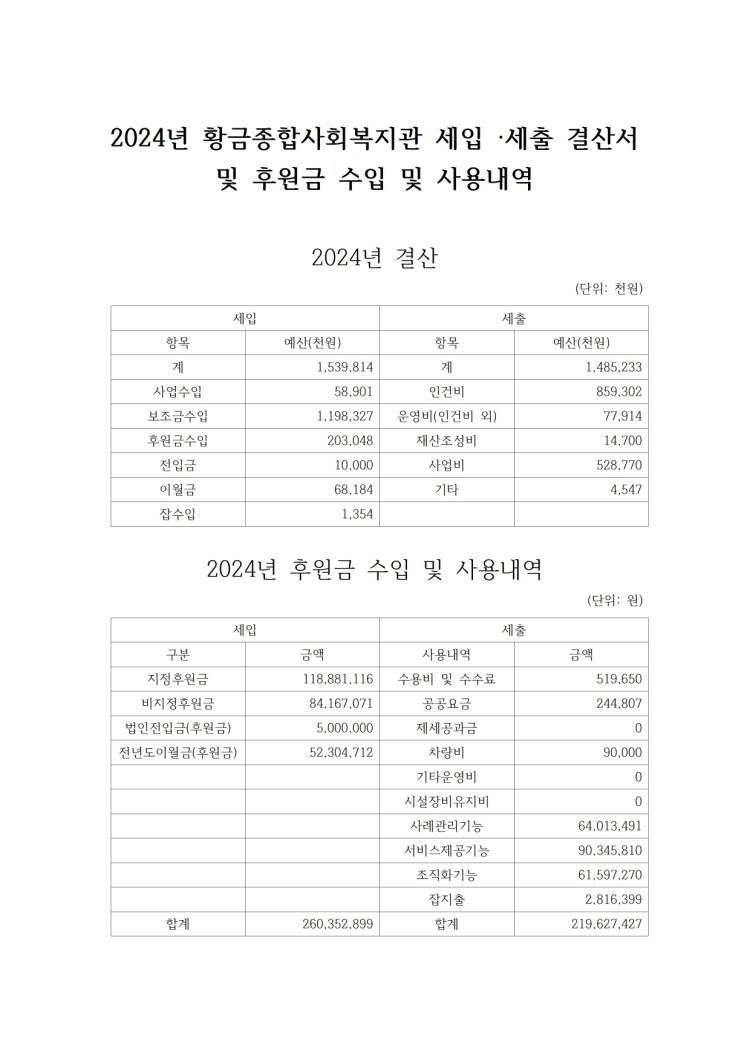 2024년 세입세출 결산서 및 후원금 수입 및 사용내역 공고